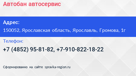 Автобан, автосервис по адресу 150052, Ярославская область, Ярославль, Громова, 1г в дальнейшем Организация, размещена в следующих категориях: