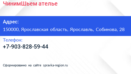ЧинимШьем, ателье по адресу 150000, Ярославская область, Ярославль, Собинова, 28 в дальнейшем Организация, размещена в следующих категориях: