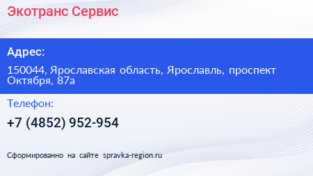 Экотранс-Сервис по адресу 150044, Ярославская область, Ярославль, проспект Октября, 87а в дальнейшем Организация, размещена в следующих категориях: