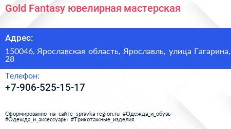 Gold Fantasy, ювелирная мастерская по адресу 150046, Ярославская область, Ярославль, улица Гагарина, 28 в дальнейшем Организация, размещена в следующих категориях: