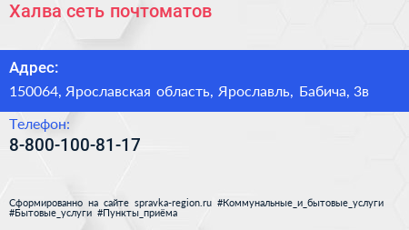 Халва, сеть почтоматов по адресу 150064, Ярославская область, Ярославль, Бабича, 3в в дальнейшем Организация, размещена в следующих категориях: