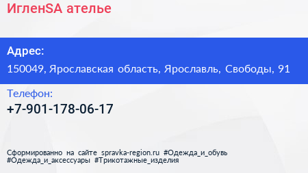 ИгленSA, ателье по адресу 150049, Ярославская область, Ярославль, Свободы, 91 в дальнейшем Организация, размещена в следующих категориях: