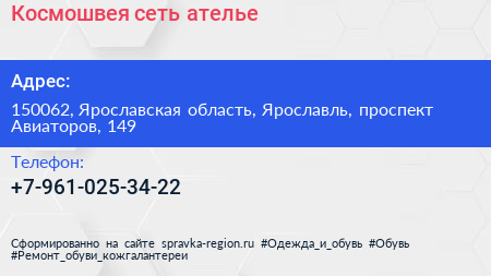 Космошвея, сеть ателье по адресу 150062, Ярославская область, Ярославль, проспект Авиаторов, 149 в дальнейшем Организация, размещена в следующих категориях: