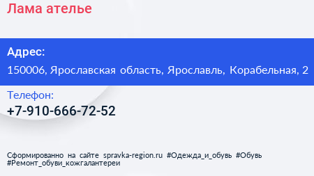 Лама, ателье по адресу 150006, Ярославская область, Ярославль, Корабельная, 2 в дальнейшем Организация, размещена в следующих категориях: