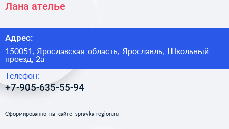 Лана, ателье по адресу 150051, Ярославская область, Ярославль, Школьный проезд, 2а в дальнейшем Организация, размещена в следующих категориях: