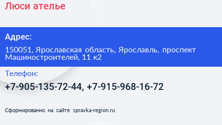 Люси, ателье по адресу 150051, Ярославская область, Ярославль, проспект Машиностроителей, 11 к2 в дальнейшем Организация, размещена в следующих категориях: