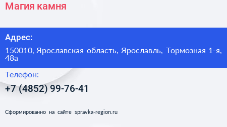 Магия камня по адресу 150010, Ярославская область, Ярославль, Тормозная 1-я, 48а в дальнейшем Организация, размещена в следующих категориях: