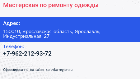 Мастерская по ремонту одежды по адресу 150010, Ярославская область, Ярославль, Индустриальная, 27 в дальнейшем Организация, размещена в следующих категориях: