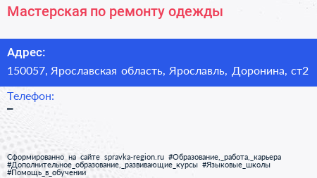 Мастерская по ремонту одежды по адресу 150057, Ярославская область, Ярославль, Доронина, ст2 в дальнейшем Организация, размещена в следующих категориях: