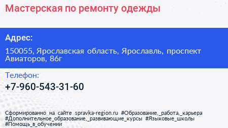 Мастерская по ремонту одежды по адресу 150055, Ярославская область, Ярославль, проспект Авиаторов, 86г в дальнейшем Организация, размещена в следующих категориях:
