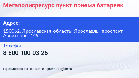 Мегаполисресурс, пункт приема батареек по адресу 150062, Ярославская область, Ярославль, проспект Авиаторов, 149 в дальнейшем Организация, размещена в следующих категориях: