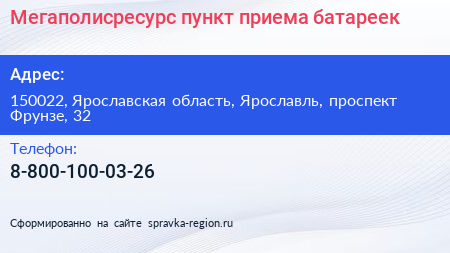 Мегаполисресурс, пункт приема батареек по адресу 150022, Ярославская область, Ярославль, проспект Фрунзе, 32 в дальнейшем Организация, размещена в следующих категориях: