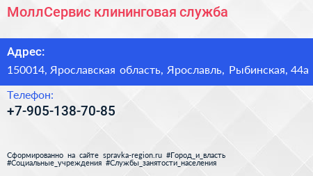 МоллСервис, клининговая служба по адресу 150014, Ярославская область, Ярославль, Рыбинская, 44а в дальнейшем Организация, размещена в следующих категориях: