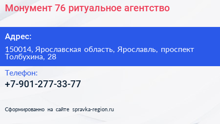 Монумент 76, ритуальное агентство по адресу 150014, Ярославская область, Ярославль, проспект Толбухина, 28 в дальнейшем Организация, размещена в следующих категориях: