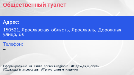Общественный туалет по адресу 150521, Ярославская область, Ярославль, Дорожная улица, 6в в дальнейшем Организация, размещена в следующих категориях: