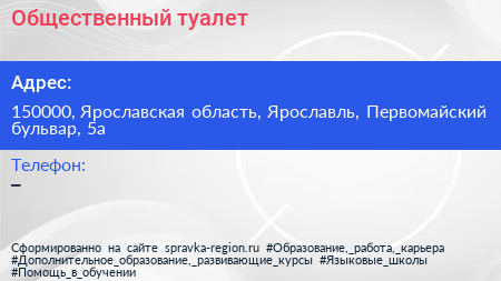 Общественный туалет по адресу 150000, Ярославская область, Ярославль, Первомайский бульвар, 5а в дальнейшем Организация, размещена в следующих категориях: