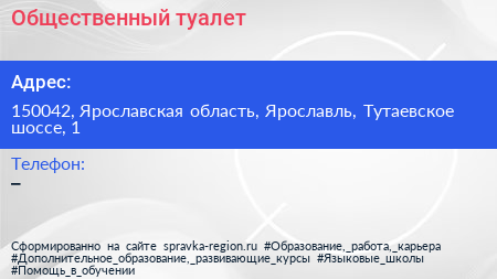 Общественный туалет по адресу 150042, Ярославская область, Ярославль, Тутаевское шоссе, 1 в дальнейшем Организация, размещена в следующих категориях: