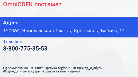 OmniCDEK, постамат по адресу 150064, Ярославская область, Ярославль, Бабича, 14 в дальнейшем Организация, размещена в следующих категориях: