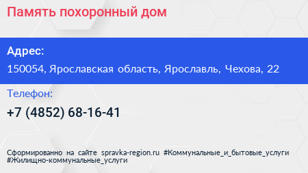 Память, похоронный дом по адресу 150054, Ярославская область, Ярославль, Чехова, 22 в дальнейшем Организация, размещена в следующих категориях: