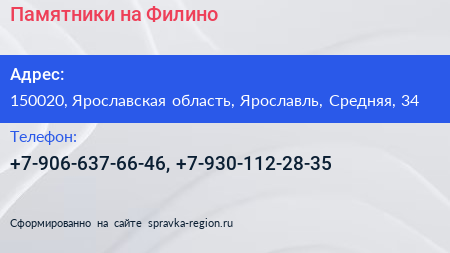 Памятники на Филино по адресу 150020, Ярославская область, Ярославль, Средняя, 34 в дальнейшем Организация, размещена в следующих категориях: