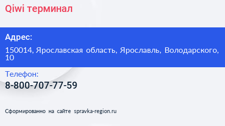 Qiwi, терминал по адресу 150014, Ярославская область, Ярославль, Володарского, 10 в дальнейшем Организация, размещена в следующих категориях: