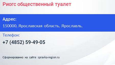 Риогс, общественный туалет по адресу 150000, Ярославская область, Ярославль, в дальнейшем Организация, размещена в следующих категориях: