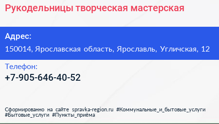 Рукодельницы, творческая мастерская по адресу 150014, Ярославская область, Ярославль, Угличская, 12 в дальнейшем Организация, размещена в следующих категориях: