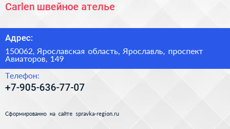 Сarlen, швейное ателье по адресу 150062, Ярославская область, Ярославль, проспект Авиаторов, 149 в дальнейшем Организация, размещена в следующих категориях: