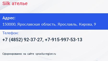 Silk, ателье по адресу 150000, Ярославская область, Ярославль, Кирова, 9 в дальнейшем Организация, размещена в следующих категориях: