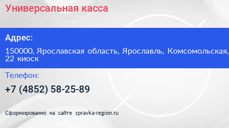 Универсальная касса по адресу 150000, Ярославская область, Ярославль, Комсомольская, 22 киоск в дальнейшем Организация, размещена в следующих категориях: