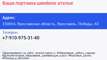 Ваша портниха, швейное ателье по адресу 150014, Ярославская область, Ярославль, Победы, 43 в дальнейшем Организация, размещена в следующих категориях: