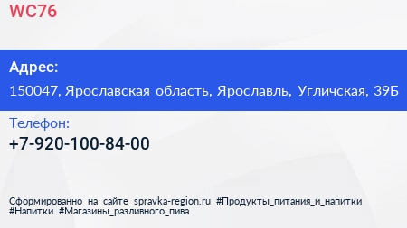 WC76 по адресу 150047, Ярославская область, Ярославль, Угличская, 39Б в дальнейшем Организация, размещена в следующих категориях: