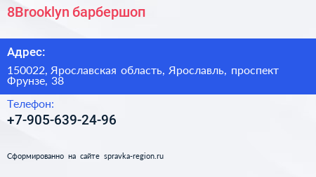 8Brooklyn, барбершоп по адресу 150022, Ярославская область, Ярославль, проспект Фрунзе, 38 в дальнейшем Организация, размещена в следующих категориях: