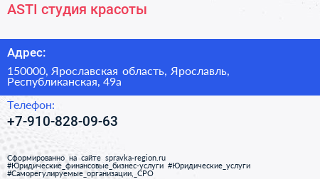 ASTI, студия красоты по адресу 150000, Ярославская область, Ярославль, Республиканская, 49а в дальнейшем Организация, размещена в следующих категориях: