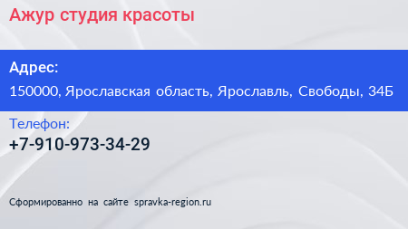 Ажур, студия красоты по адресу 150000, Ярославская область, Ярославль, Свободы, 34Б в дальнейшем Организация, размещена в следующих категориях: