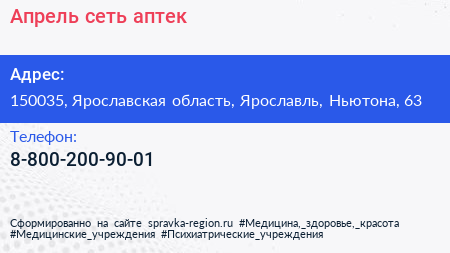 Апрель, сеть аптек по адресу 150035, Ярославская область, Ярославль, Ньютона, 63 в дальнейшем Организация, размещена в следующих категориях: