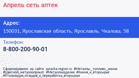 Апрель, сеть аптек по адресу 150031, Ярославская область, Ярославль, Чкалова, 58 в дальнейшем Организация, размещена в следующих категориях: