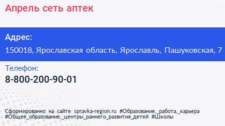 Апрель, сеть аптек по адресу 150018, Ярославская область, Ярославль, Пашуковская, 7 в дальнейшем Организация, размещена в следующих категориях: