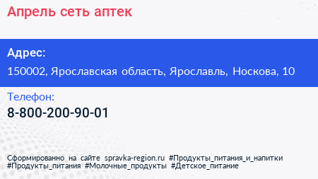 Апрель, сеть аптек по адресу 150002, Ярославская область, Ярославль, Носкова, 10 в дальнейшем Организация, размещена в следующих категориях: