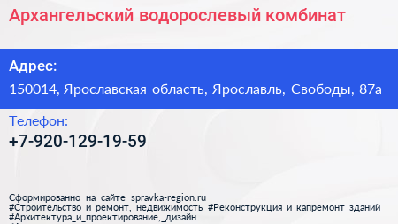 Архангельский водорослевый комбинат по адресу 150014, Ярославская область, Ярославль, Свободы, 87а в дальнейшем Организация, размещена в следующих категориях: