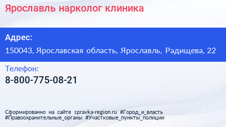 Ярославль-нарколог, клиника по адресу 150043, Ярославская область, Ярославль, Радищева, 22 в дальнейшем Организация, размещена в следующих категориях: