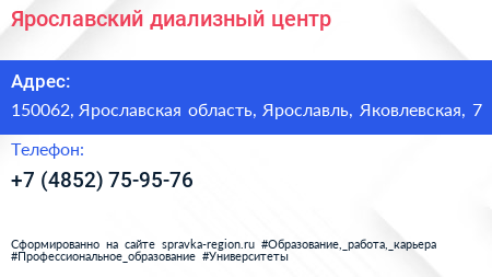 Ярославский диализный центр по адресу 150062, Ярославская область, Ярославль, Яковлевская, 7 в дальнейшем Организация, размещена в следующих категориях: