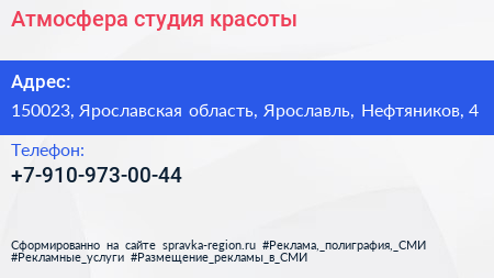 Атмосфера, студия красоты по адресу 150023, Ярославская область, Ярославль, Нефтяников, 4 в дальнейшем Организация, размещена в следующих категориях: