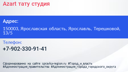 Azart, тату-студия по адресу 150003, Ярославская область, Ярославль, Терешковой, 13/5 в дальнейшем Организация, размещена в следующих категориях: