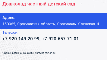 Дошколад, частный детский сад по адресу 150065, Ярославская область, Ярославль, Сосновая, 4 в дальнейшем Организация, размещена в следующих категориях: