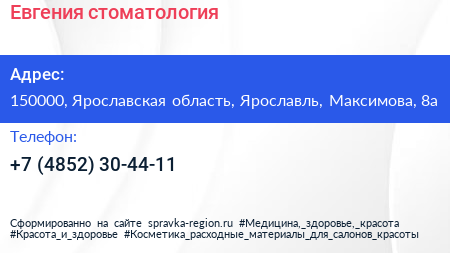 Евгения, стоматология по адресу 150000, Ярославская область, Ярославль, Максимова, 8а в дальнейшем Организация, размещена в следующих категориях: