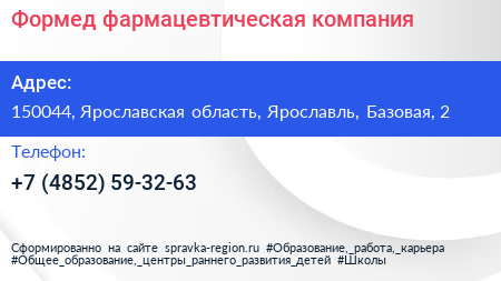 Формед, фармацевтическая компания по адресу 150044, Ярославская область, Ярославль, Базовая, 2 в дальнейшем Организация, размещена в следующих категориях: