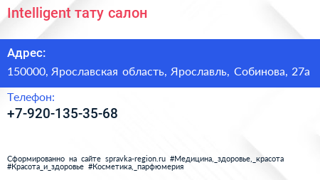 Intelligent, тату-салон по адресу 150000, Ярославская область, Ярославль, Собинова, 27а в дальнейшем Организация, размещена в следующих категориях: