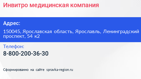 Инвитро, медицинская компания по адресу 150045, Ярославская область, Ярославль, Ленинградский проспект, 54 к2 в дальнейшем Организация, размещена в следующих категориях: