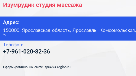 Изумрудик, студия массажа по адресу 150000, Ярославская область, Ярославль, Комсомольская, 5 в дальнейшем Организация, размещена в следующих категориях: